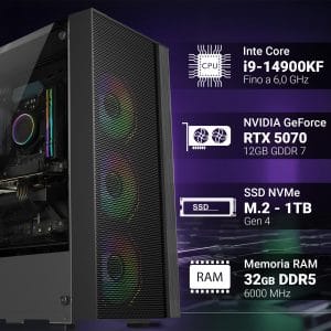 PC Gaming Fisso – Computer Gaming Intel i9-14900KF • Scheda Video RTX 5070 12GB • RAM 32GB DDR5 • SSD 1TB NVMe • Wi-Fi AC e Bluetooth • HDMI e DisplayPort • USB 3.2 • Windows 11 Pro